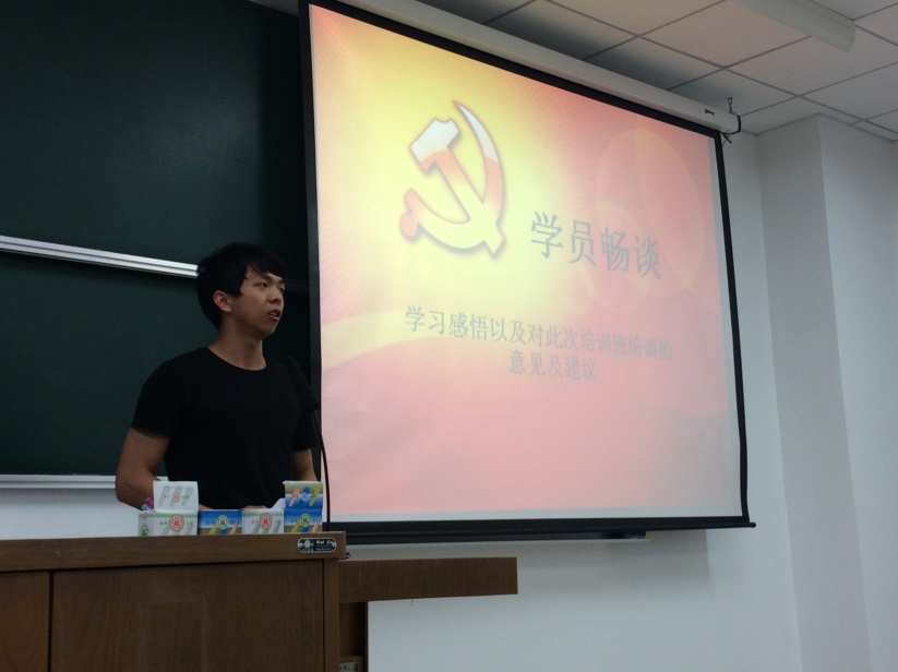 交流会开始,学生支部书记兼本期培训班班长徐佳佳介绍本次畅谈会的流程。紧接着,培训学员们针对为期一个月的培训班课程轮流发言,分享学习感悟,提出对本次培训活动的意见及建议。通过这次培训班的学习,同学边祥雨认为在与一些老党员的接触以及党员光荣事迹的了解的过程中,他学习到很多优秀精神。作为学生,他认为脚踏实地地做好自己本职的事是最基本的,巩固本领和完善品德,才能更好地服务人民、服务社会。同时,他认为党员实践活动和志愿者义务劳动活动是极其有意义的,建议增加活动次数、扩大活动范围,可以使党员的奉献精神更好地体现出来。