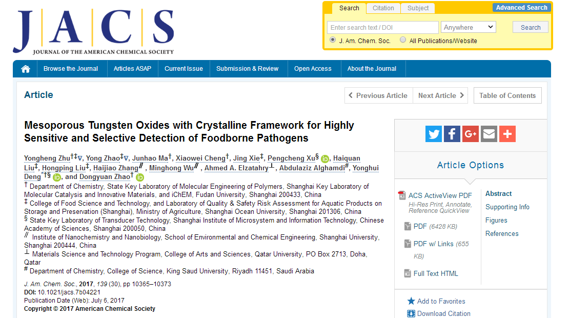 近日,美国化学会顶尖期刊《美国化学会志》在线发表上海海洋大学与复旦大学合作的研究论文《Mesoporous Tungsten Oxides with Crystalline Framework for Highly Sensitive and Selective Detection of Foodborne Pathogens》(J. Am. Chem. Soc. 2017, 139, 10365−10373,IF=13.858)。上海海洋大学食品学院朱永恒副教授和赵勇教授为论文的共同第一作者,复旦大学化学系邓勇辉教授为论文的通讯作者。该研究团队设计合成出一系列具有规整纳米孔道和高比表面积三氧化钨(WO3)半导体材料,并将其制作成气敏纳米器件,首次将该类半导体器件用于快速选择性地检测食源性致病菌。