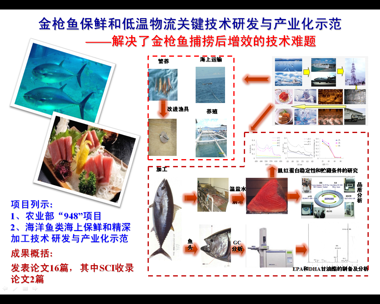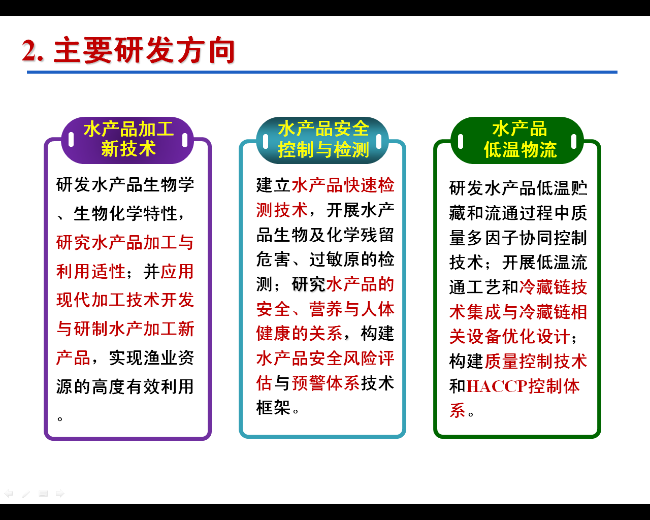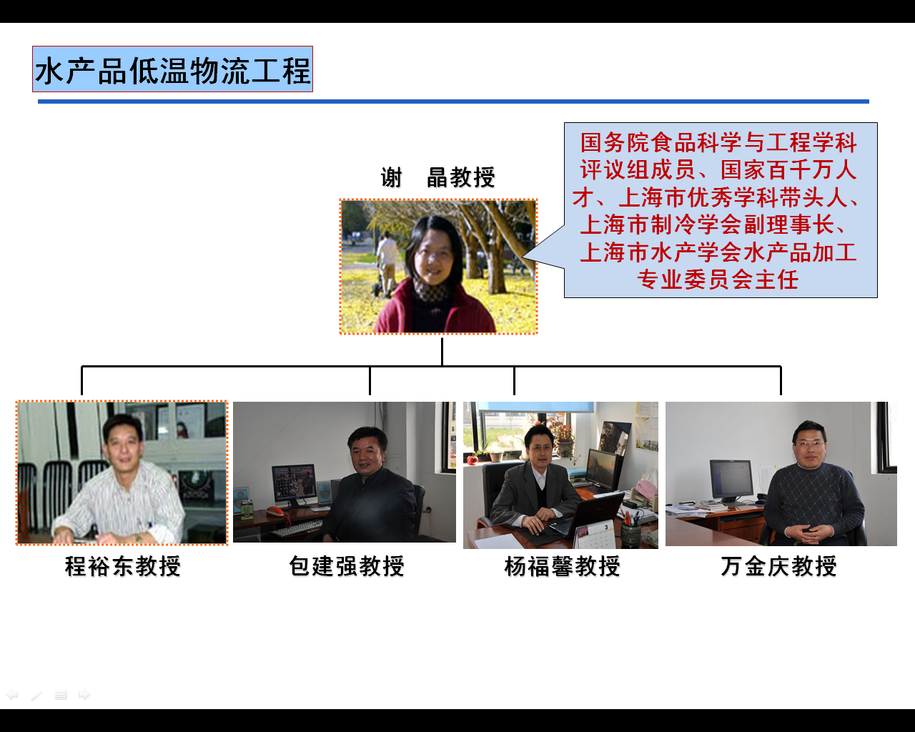 主要研究水产品低温贮藏和流通过程中质量多因子协同控制技术,使水产品货架期得到有效延长,提升其品质和贮藏稳定性;不同水产品低温流通工艺和冷藏链技术集成与冷藏链相关设备优化设计,以及水产品生产、贮藏和食品冷藏链流通过程中的质量控制技术和HACCP控制体系的构建;水产品在低温物流中的标准、操作规程等研究,以利用冷藏链技术来保证水产品安全、高品质、低损耗地流通。