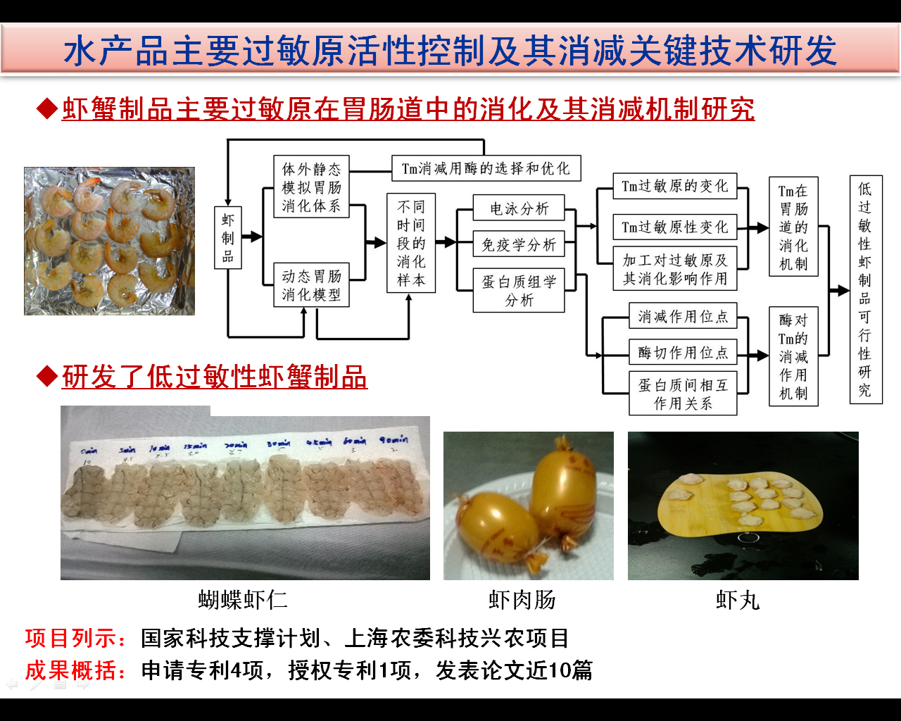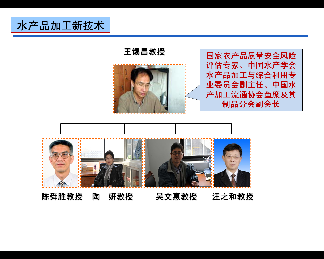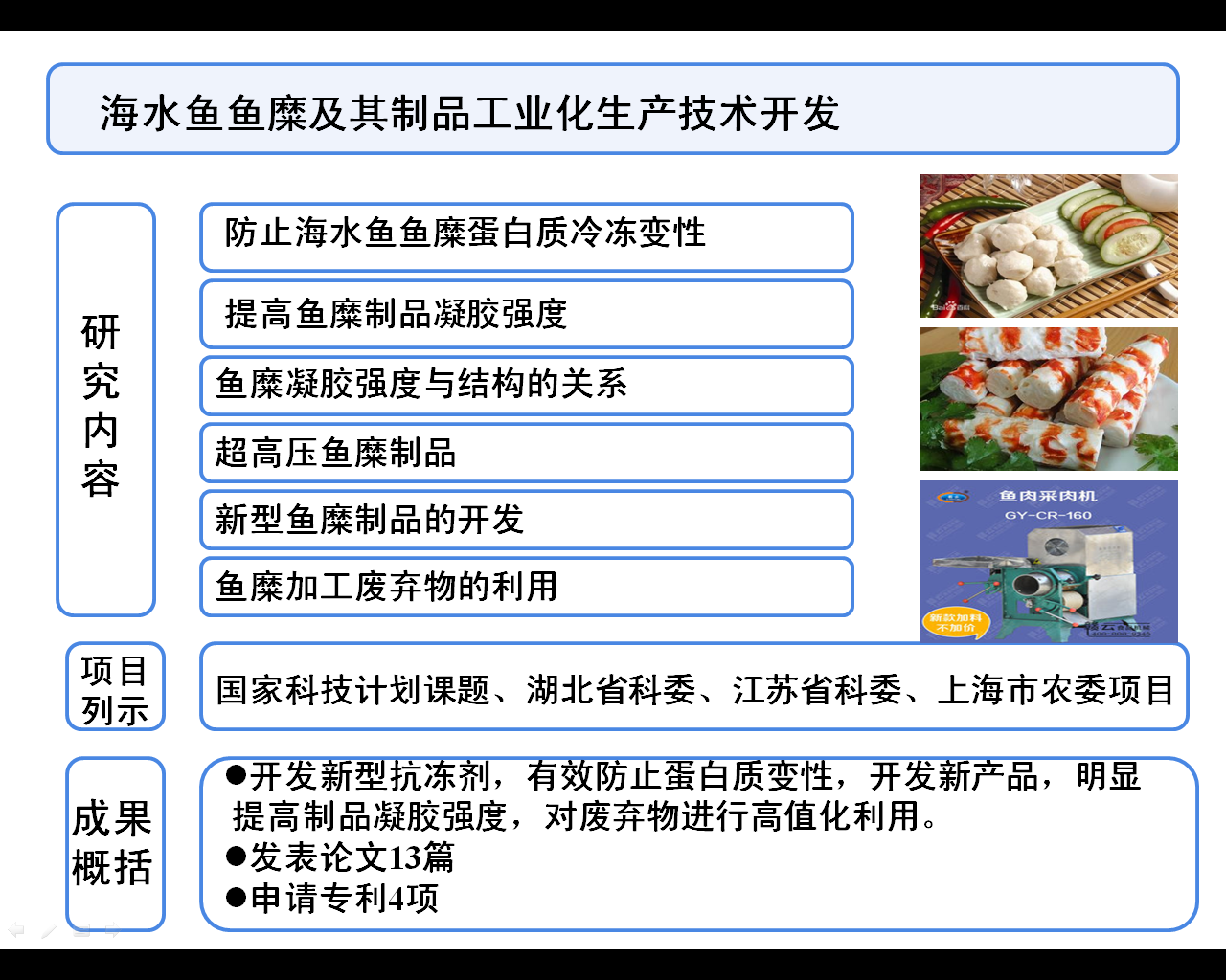 主要研究水产品低温贮藏和流通过程中质量多因子协同控制技术,使水产品货架期得到有效延长,提升其品质和贮藏稳定性;不同水产品低温流通工艺和冷藏链技术集成与冷藏链相关设备优化设计,以及水产品生产、贮藏和食品冷藏链流通过程中的质量控制技术和HACCP控制体系的构建;水产品在低温物流中的标准、操作规程等研究,以利用冷藏链技术来保证水产品安全、高品质、低损耗地流通。