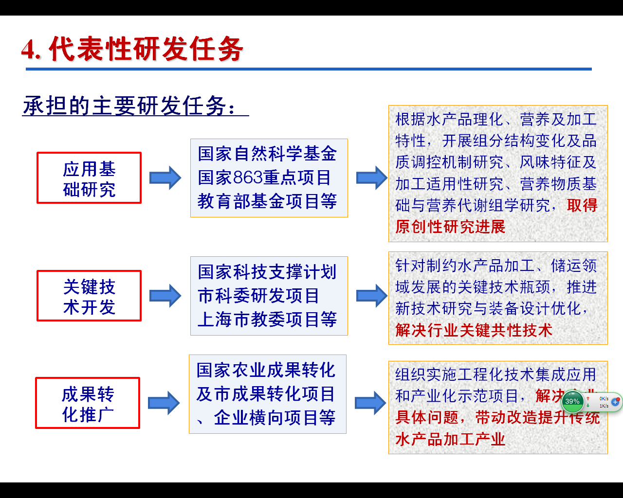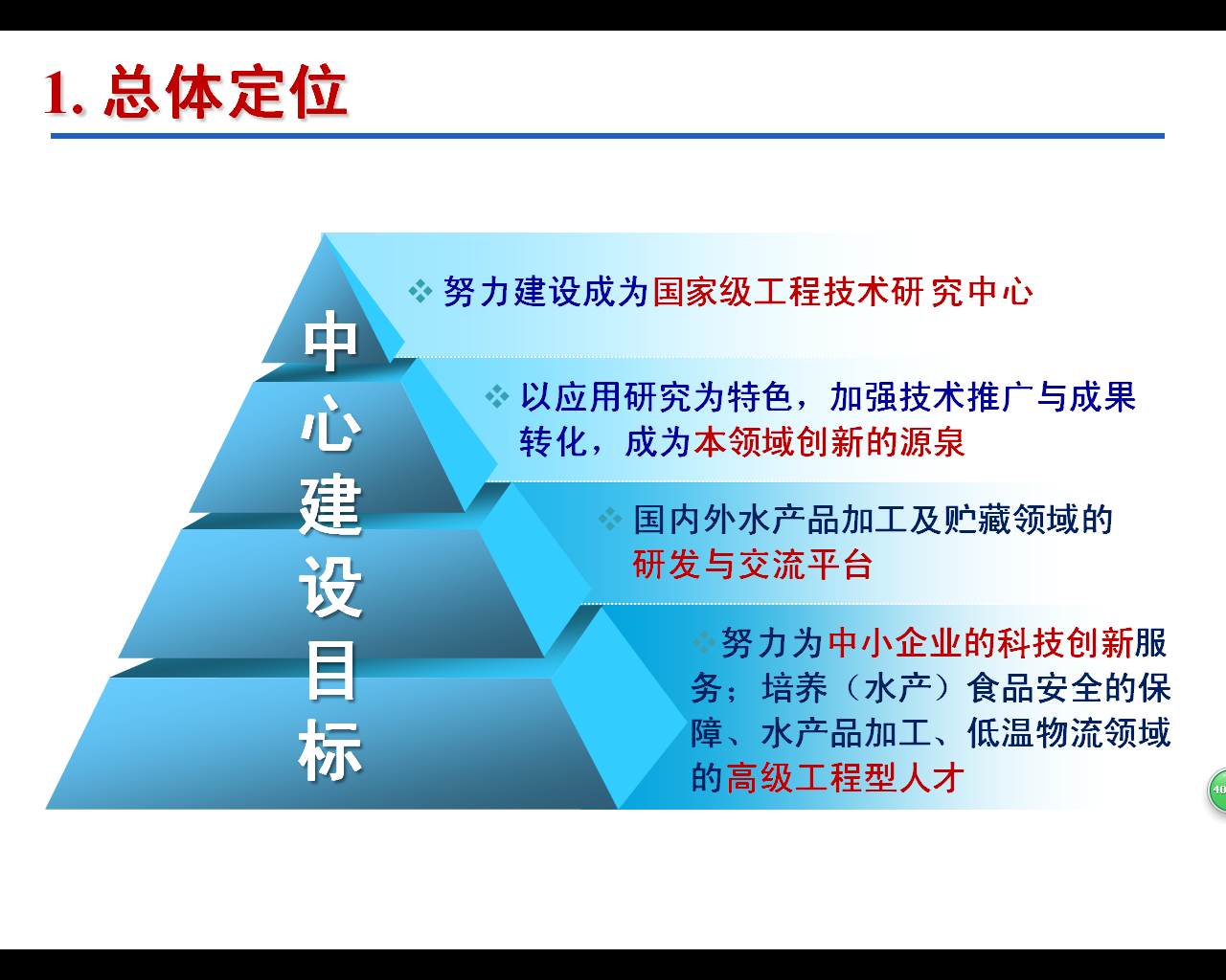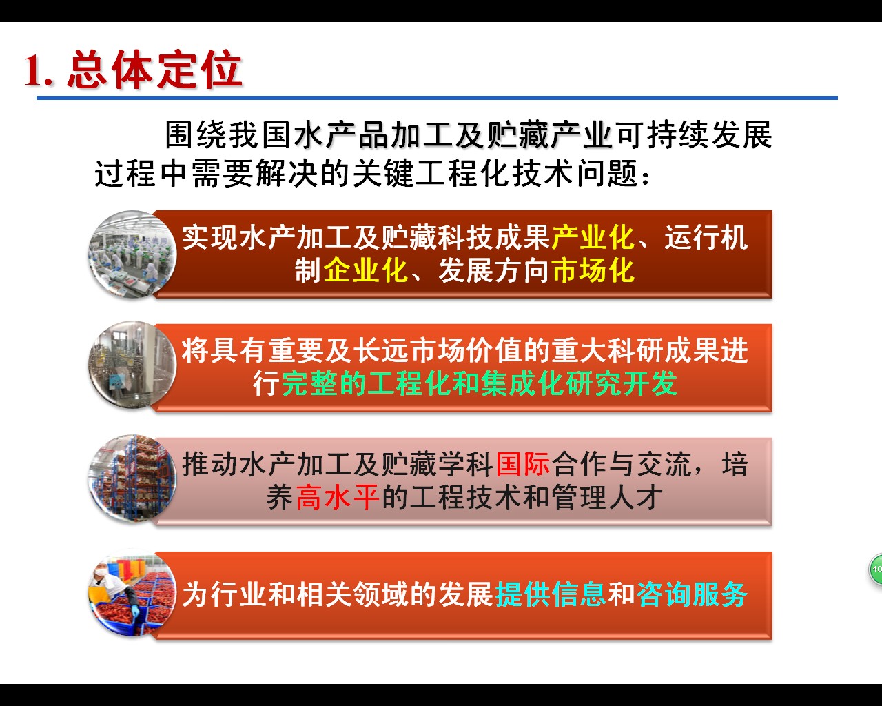 本工程中心以应用研究为特色,依托学校的优势学科——水产品加工及贮藏工程,解决水产加工产业发展中的关键技术问题,在提升与改造传统产业、拓展产业链方面,加强技术推广与成果转化;以需求为导向,实行开放服务,在水产品加工新技术、水产品低温物流与贮藏保鲜、水产品安全检测与风险评估这三个重点方向进行工程化技术的研发与推广。