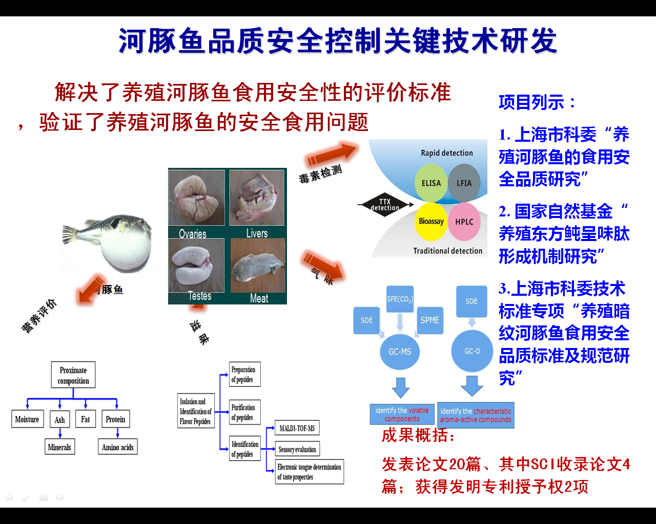 主要研究水产品产生的气象色谱指纹图、质谱指纹图、气味指纹图,获得其结构指纹和气味指纹信息,实现对未知样品安全性的快速检测;构建常见食源性致病菌的特异性抗体库和纳米检测探针;建立测定常见生物毒素灵敏、快速的现场检测方法,开展食物资源相关的生物毒素及其残留的监测。根据污染物监测结果、毒理学资料和膳食暴露资料,对其中对人体健康可能有较大影响的指标进行风险评估;构建水产品安全预警体系技术框架。