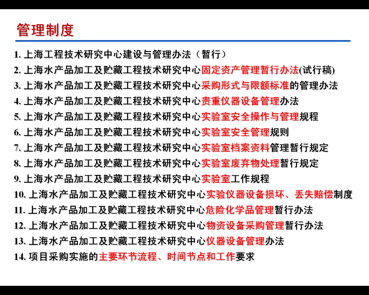 上海水产品加工及贮藏工程技术研究中心以上海市科学技术委员会为归口管理部门,以食品科学与工程一级学科、水产品贮藏与加工二级学科为基础,主要研究水产品加工新技术、水产品安全控制与检测、水产品低温物流工程,通过对水产品生产、加工、流通全过程的品质和安全的控制与管理,保证水产品的营养品质和卫生质量,促进人体的健康。水产品质量与安全的保证主要依靠水产品生产全过程的质量与安全管理,包括食品安全、食品毒理学、食品加工与装备、食品质量控制与风险评估等诸多领域。中心主要依托于上海海洋大学的公益性服务和技术推广机构,独立核算,并在技术上相对独立。上海海洋大学委托校资产经营公司具体管理工程中心的国有资产,负责监督资产及经费使用情况,负责提供工程中心组建和运行中所必需的配套资金,并在人才和政策给予保障。校科技处负责管理中心的业务。