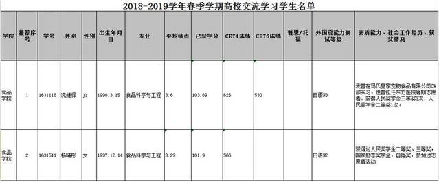 根据教务处文件《关于选派2018-2019学年春季学期赴日本7所学校交流学习的通知》和《上海海洋大学食品学院学生出国(境)交流学习工作实施办法(试行)》的要求,经个人申请,食品学院审议,现将食品学院2018-2019学年春季学期赴日本北海道大学交流学习候选人进行排序后上报教务处,特此公示。公示时间2018年10月18日—2018年10月22日。