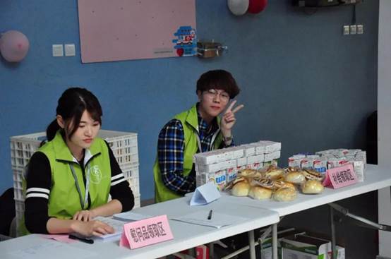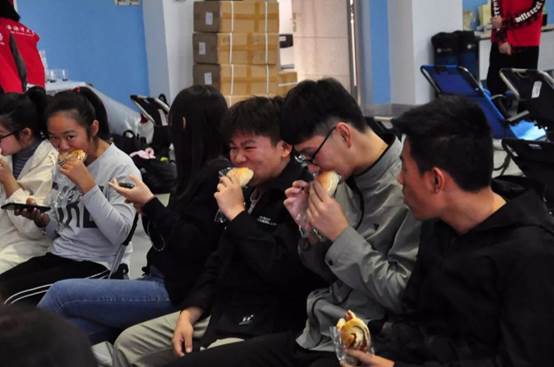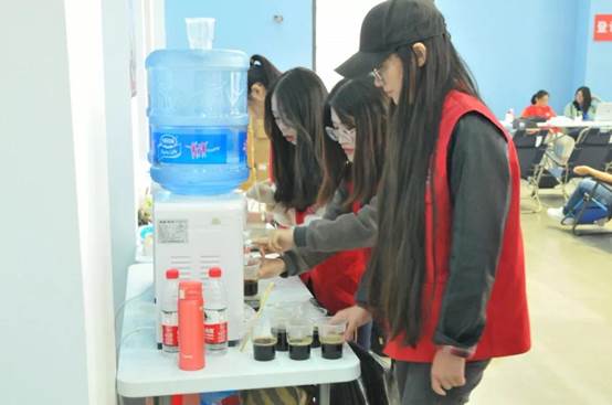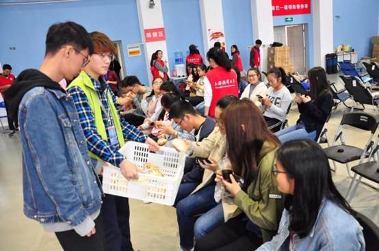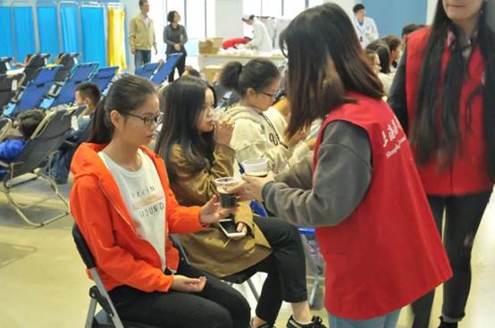 等待献血的同学们正在补充能量