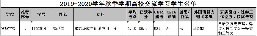 根据教务处文件《关于选派2019-2020学年秋季学期赴日本岩手大学交流学生的通知》,经个人申请,食品学院审议,共1位同学申报且符合各项指标,特此公示。公示时间2019年5月5日-2019年5月7日。