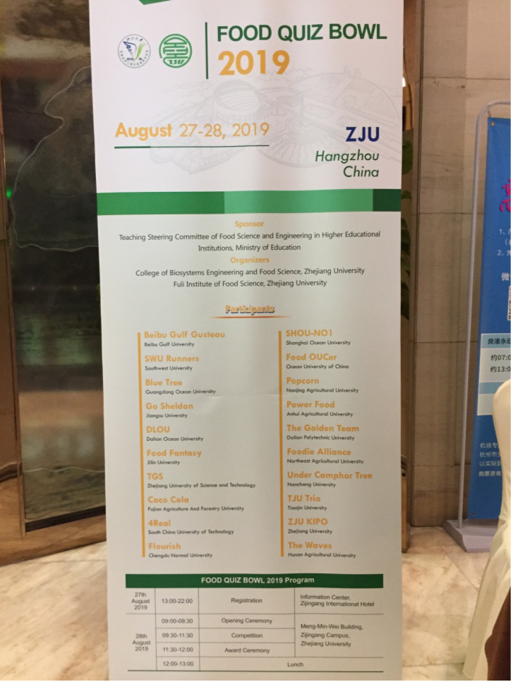 决赛于2019年8月28日在西子湖畔的浙江大学举行。现场采用英语为工作语言快速问答,竞赛题目及答案以英文形式呈现。上海海洋大学食品学院学生团队在决赛的上半场中稳扎稳打,最终在总决赛中取得了第三名的好成绩。
