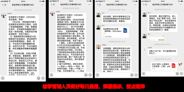 学工条线的辅导员们也没闲着,他们在继续做好信息排摸的同时,组织学生参加《2020年春季学期学生在线学习专题培训》,及时告知《关于2020年春季学期学生教材发放的通知》以及教材邮政运单号。为确保每位同学进入每位教师的课堂,每位辅导员严阵以待,当某位教师上传学生名册、说还有几位同学没签到时,“我来通知”,辅导员们总是主动请缨、协助专任教师找到学生予以沟通,学生秘书陈力老师则主动认领全校任选课和跨学院的课程缺席学生,主动与兄弟学院进行沟通、落实,一时间,几个微信群聊好不热闹,紧张而有序地相互回应着……