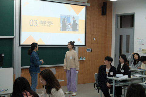 第二环节是情景模拟,为了考验选手的临场配合能力,25位同学重新分配组别,在经过短暂的思考后上台进行情景模拟,尝试解决突发或棘手问题。在这一轮的展示中,各组选手顺利完成任务,展示了优秀的临场配合能力,参赛者机敏的应变和不凡的谈吐,也得到评委的频频点头认可。