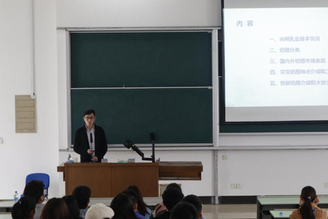 随后,光明乳业研发部洪青经理从光明乳业的基本情况入手,向同学们详细地介绍了光明乳业的发展历程和企业特色,又深入浅出地给同学们科普了奶酪的制作工艺,最后他还介绍了光明乳业近几年研发的创新奶酪。这不仅让同学们对创新奶酪有了更形象的认识,还为同学们后续的产品创新提供了新的思路。