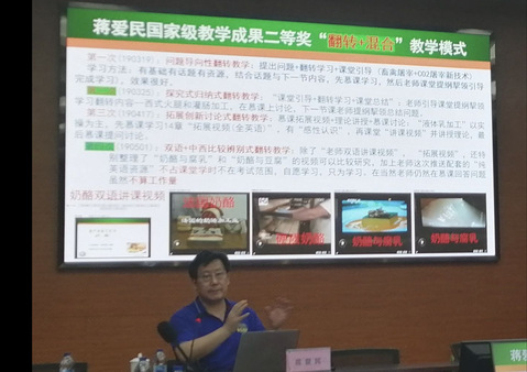 会议主讲嘉宾为华南农业大学二级教授、国务院特殊津贴专家、国家级教学名师蒋爱民博士。蒋爱民教授以自身的《畜产食品工艺学》和《食品原料学》一流课程培育、建设和成果申请为案例,围绕一流课程建设的应用发展趋势、课程建设及应用模式、混合教学设计及应用技巧、一流课程申报注意事项、基于一流课程建设的教学成果培育与申请准备及其注意事项等内容作了生动形象、风趣幽默的报告,并和老师们分享了课程思政和“两性一度”教学案例和一流课程建设心得体会,会后又详细回答了学院老师们在课程建设过程的困惑和问题。