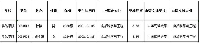 根据教务处文件《关于2021-2022年秋季学期选派学生赴国内海洋类高校交流学习的通知》和《上海海洋大学食品学院学生出国(境)交流学习工作实施办法(试行)》的要求,经个人申请,食品学院审议,现将食品学院2021-2022年秋季学期选派学生赴国内海洋类高校交流学习候选人上报教务处,特此公示。公示时间2021年6月24日—2021年6月28日。