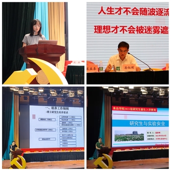 会议第二阶段专题报告会分别为入党启蒙教育、规则意识教育、研究生学位管理制度介绍和实验室安全专题报告。首先,由食品学院专职组织员杨晗为新生们开展入党启蒙教育,杨老师从“党章”、“党史”、及“如何树立正确的入党心理动机”等方面入手,叮嘱同学们要倍加珍惜中国共产党多年艰苦奋斗打下的良好基础,主动学习党的理论知识,提高自身思想觉悟,努力发展成为一名合格的中共党员。紧接着,由院党委副书记孙红刚开展规则意识教育,告诫同学们在疫情防控期间严格遵守疫情防控相关规定,做好自我防护措施,为自己及他人的健康安全着想。副院长宋益善和研究生秘书阎俊对研究生的培养情况进行了介绍和答疑。最后,学院实验中心主任蓝蔚青以其丰富的理论和实践安全知识为同学们讲解了实验室安全知识,并提醒全体新生要提高实验安全意识,遵守学院实验管理规则。