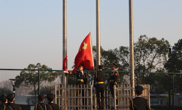 上午7时整,升旗仪式正式开始。在冬日温暖的阳光下,升旗手护送国旗来到升旗台前,在场全体人员庄严地向国旗行注目礼,并高唱国歌。伴随着激昂雄壮的《义勇军进行曲》,五星红旗冉冉升起,在晨风中高高飘扬、在旭日照射之下熠熠生辉。