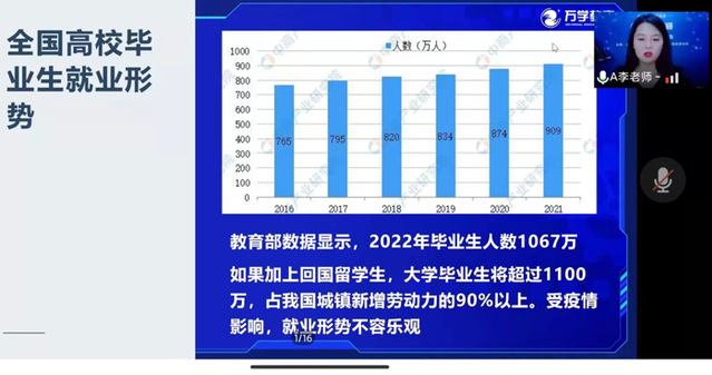讲座伊始,李蓬勃为同学们介绍了2022年全国高校毕业生的就业形势、出国出境留学趋势以及公务员报考及录取情况。李蓬勃指出由于疫情原因,学生出国出境留学深造将受到重大影响。根据最新数据表明,多数留学生在毕业季也是选择回国就业,所以毕业生的就业压力增大,使得如今报考研究生的人数日益增多。