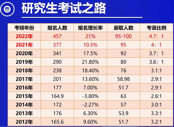 接着,李蓬勃重点对考研政策进行了深入的讲解。2022年,高校平均考录比例高达4.7:1,相较于去年,同比增长21%,由此可见考研的“内卷”。然而,相比较于报考人数的增加,高校研招扩张的趋势为大力发展专业学位,这一信息为日后报考研究生的同学提供了建设性的指引。