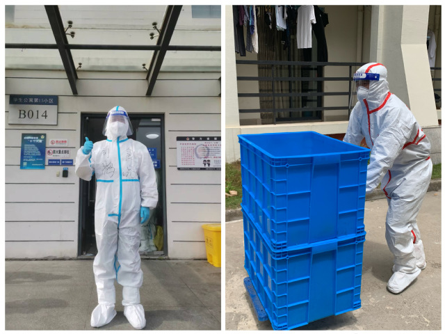 近一个月来,食品学院党委委员刘鹏和本科生第三党支部书记刘源入驻学生社区,穿上“大白”化身为宿管员、快递员、保洁员、检测志愿者,牢牢将病毒隔离在外,保护每一位同学的健康和安全。为了节省防护服,他们一穿就是12个小时以上,在这期间完成送餐、送药、清运垃圾、保洁、核酸检测等工作,和社区内的师生们一起用坚守、担当和奉献,在战“疫”一线践行初心使命。
