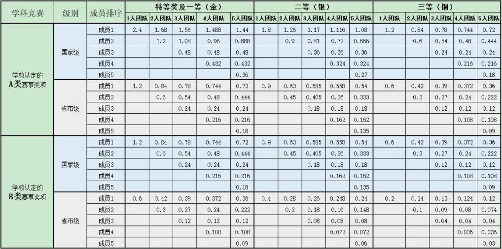 以团队获得奖励荣誉的,按照贡献度依次计算绩点,各成员绩点分配比例见附表3。