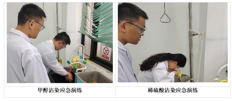 为加强学院相关专业学生的安全意识和应急处理能力,食品学院根据学校发布的“关于开展2023年安全生产月活动”的通知要求,于7月10日在食品检测实验室A408室分别组织开展了“甲醇沾染皮肤的急救处置”与“稀硫酸溶液进入眼睛的急救处置”实验室安全应急演练活动。