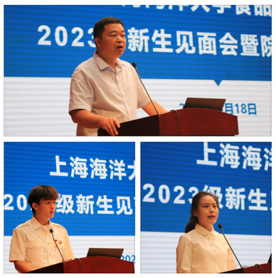 本科生老生2020级能源与动力工程专业学生李俊杰回顾了自己的军旅生涯及校园生活,以“热心”“决心”“恒心”三个关键词串联演讲,他号召大家铭记“民以食为天”是食品人的责任、“满足人民群众对美好生活的向往”是食品人攻坚克难的动力;研究生新生2023级食品科学与工程专业赵嘉怡从“严于律己”“尊师肯学”“志存高远”等层面展望了崭新的研究生生涯,她表示“学习贯彻党的二十大精神,践行健康中国新理念,海大食品人责无旁贷!”。