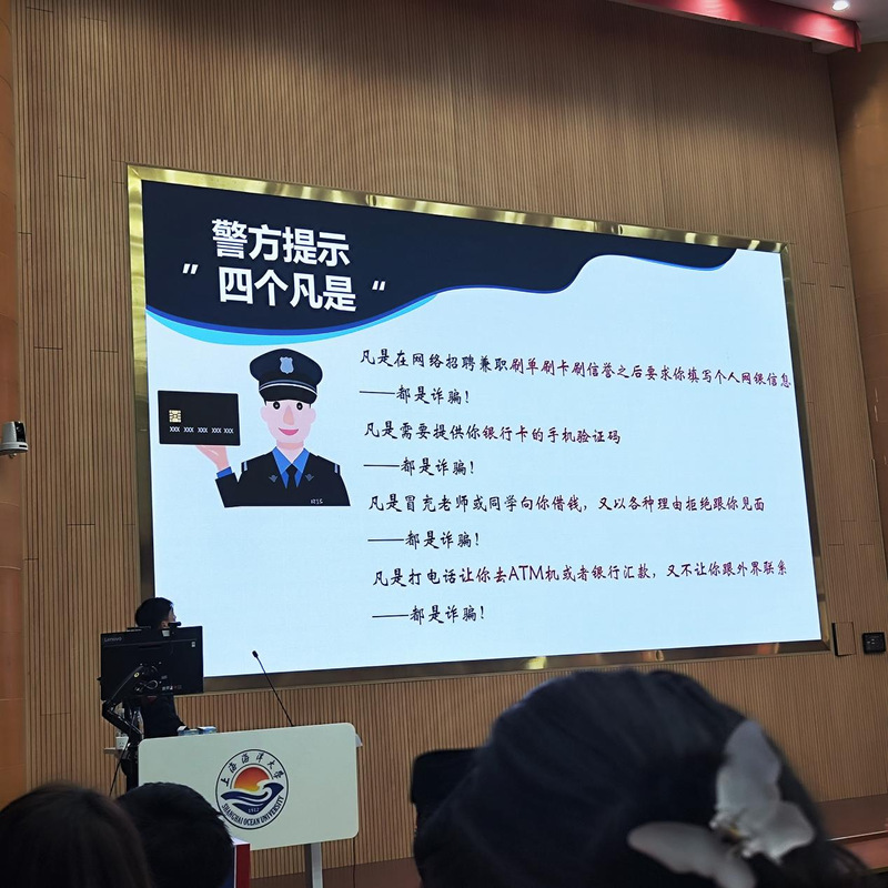 为响应习近平总书记对打击治理电信网络诈骗犯罪工作作出的重要指示,坚持以人民为中心,全面落实打防管控措施,坚决遏制电信网络诈骗犯罪多发高发态势,提高同学们对电信诈骗的认知和警觉性,增强同学们的防骗意识,10月31日下午,临港新片区公安青年反诈宣讲团来到上海海洋大学为食品学院的同学们宣讲反诈骗知识。
