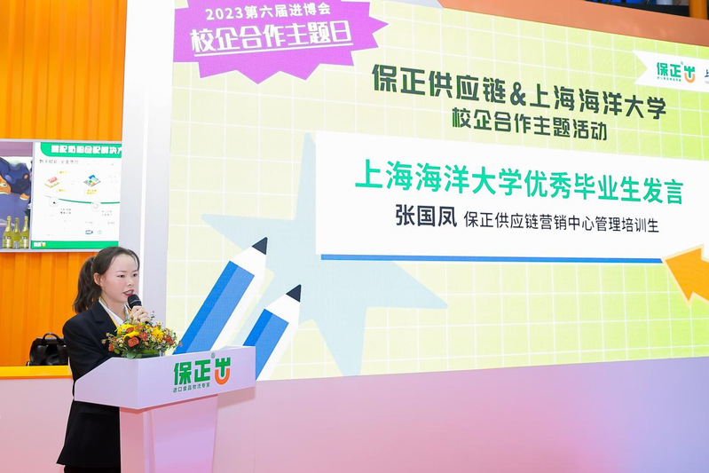 在今年6月,保正向我校捐赠了奖学金及奖教金,希望以此次捐赠为契机,以实际行动践行保正“传递正能量”的理念精神。至今,上海海洋大学已经评选出第一批获得“保正奖学金”的优秀学子,因此,本次活动现场还进行了2023年度“保正奖学金”颁奖仪式,向获得2023年度“保正奖学金”的6位同学颁发获奖证书。李兰心同学作为获奖同学代表上台发言,既表达了对保正供应链设立奖学金的感谢,又代表学生们表明了努力学习、钻研食品领域的决心。