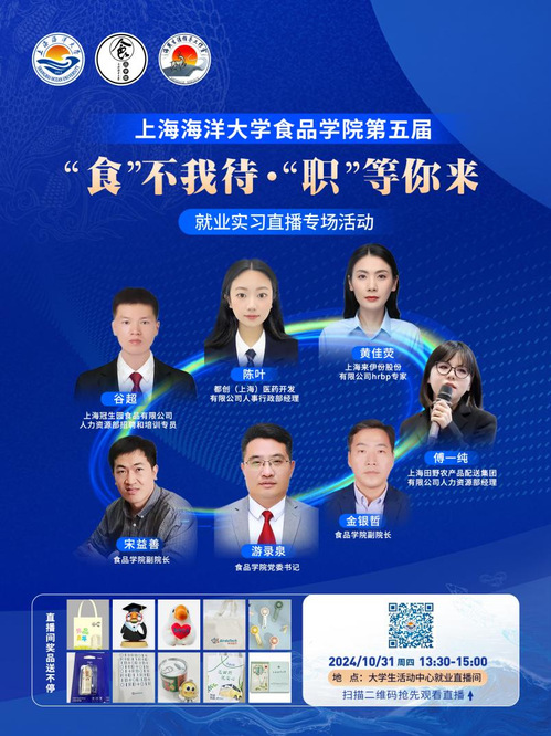 “直播带岗”搭梯,“云上服务”架桥,为助力2025届毕业生高质量充分就业,食品学院于10月31日召开第五届“食”不我待·“职”等你来——就业实习直播专场活动。食品学院党委书记游录泉、副院长金银哲、副院长宋益善出席,上海田野农产品配送集团有限公司、都创(上海)医药开发有限公司、上海冠生园食品有限公司、上海来伊份股份有限公司四家企业用人单位代表受邀参与。直播由2025届本科生毕业生窦肖博和2023级研究生陈颖珂共同主持。