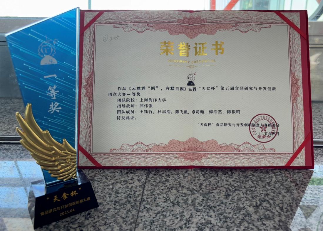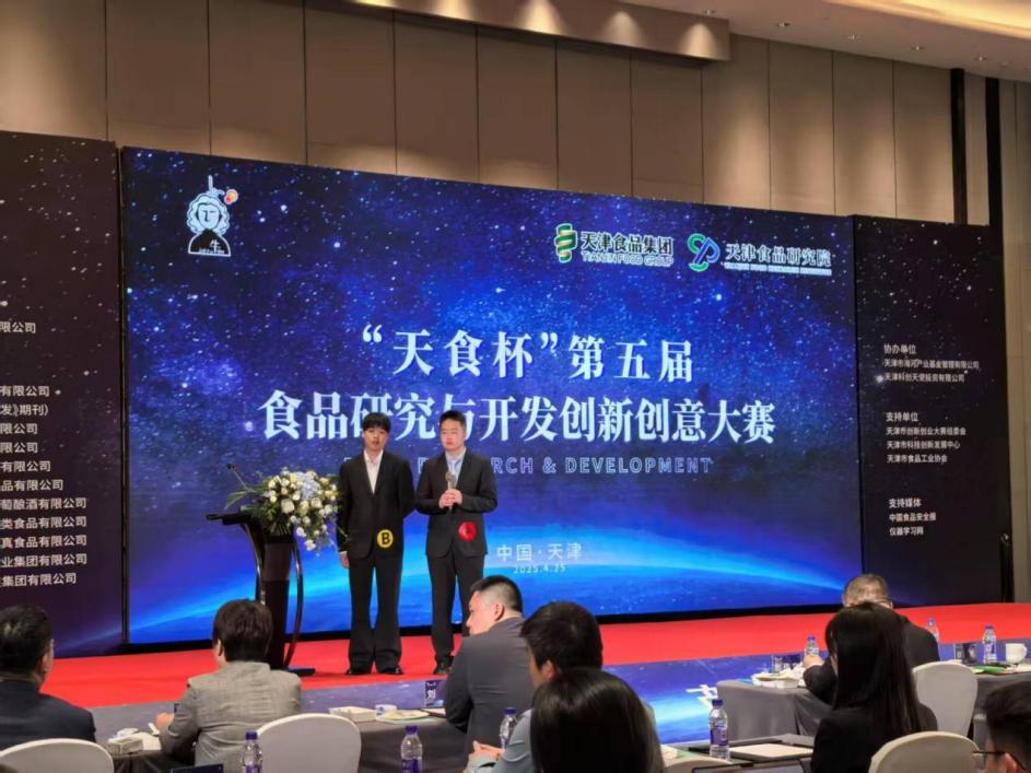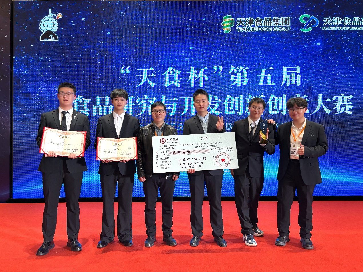 2025年4月25日,由天津食品集团主办、天津食品研究院主承办的“天食杯”第五届食品研究与开发创新创意大赛决赛在天津顺利举行。我校由王钰竹,桂志浩,陈飞帆,章司翰,梅浩然和陈毅鸣同学申报,邱伟强老师指导的作品“云霓霁‘鳕’,有糕自溟”凭借出色的项目表现,斩获一等奖;由方紫凌,林雯敏,赵佳怡,赵海娜和王述平同学申报,包海蓉老师指导的作品“四时果味·茶香飘飘”,荣获优秀奖。同时,邱伟强老师获得了优秀指导教师奖。