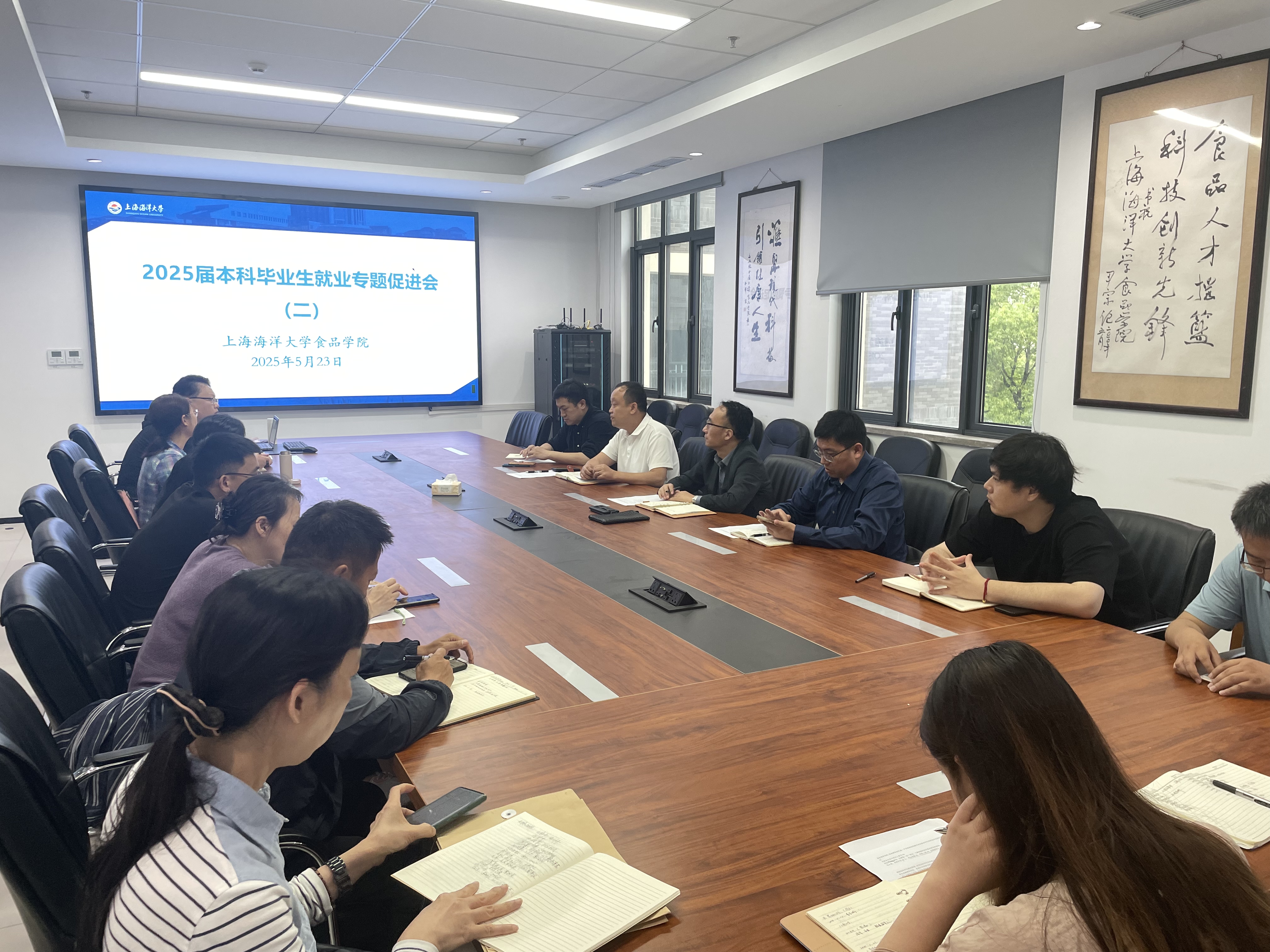 5月23日,上海海洋大学食品学院在A206会议室召开2025届本科毕业生就业专题促进会。学院全体领导班子、系主任、专业负责人、班主任、就业指导员及毕业班辅导员齐聚一堂,深入分析当前就业形势,研讨精准帮扶举措,全力推进毕业生高质量就业。